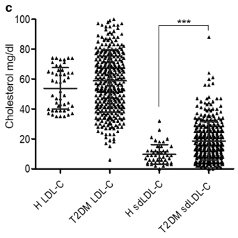 平頂山市人民醫(yī)院內(nèi)分泌與代謝科的田勇等人[5],招募了包括352名T2DM患者(男194名,女158名,平均年齡60.63歲)和48名健康人(男34名,女14名,平均年齡45.38歲)的受試者。探討多基因多態(tài)性、LDL-C和sdLDL-C在T2DM治療中的臨床價值。研究時間從2018年5月至2020年1月。研究發(fā)現(xiàn),sdLDL-C主要存在于T2DM患者體內(nèi),且T2DM患者sdLDL-C的平均水平高于健康人。治療后,LDL-C和sdLDL-C的表達較治療前降低且差異顯著(p?0.001)。結(jié)果表明,sdLDL-C是T2DM的高危因素。LDL-C和sdLDL-C是T2DM治療的良好監(jiān)測生物標(biāo)志物。