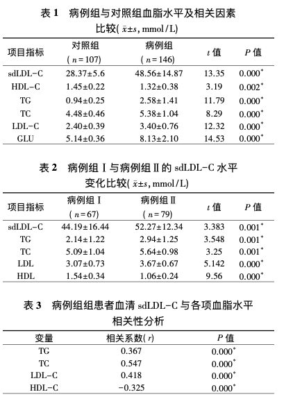 齊齊哈爾醫(yī)學(xué)院附屬第三醫(yī)院的楊秀靜等[6],將146例T2DM患(其中男85例,女61例;年齡30~70歲)中單純T2DM患者67例為病例組Ⅰ,T2DM及并發(fā)癥患者79例為病例組Ⅱ;另選擇同期健康體檢者107名作為對照組。兩組均進行sd LDL-C、GLU、TC、TG、LDL-C、HDL-C檢測。觀察T2DM及其并發(fā)癥患者血清中sdLDL-C水平變化情況并分析其臨床應(yīng)用價值。研究結(jié)果表明,sd LDL-C在T2DM患者中升高明顯,sd LDL-C與TG、TC、LDL-C呈正相關(guān)與HDL-C呈負相關(guān)。觀察sd LDL-C的變化情況可用于預(yù)測T2DM并發(fā)癥病變發(fā)生風(fēng)險。