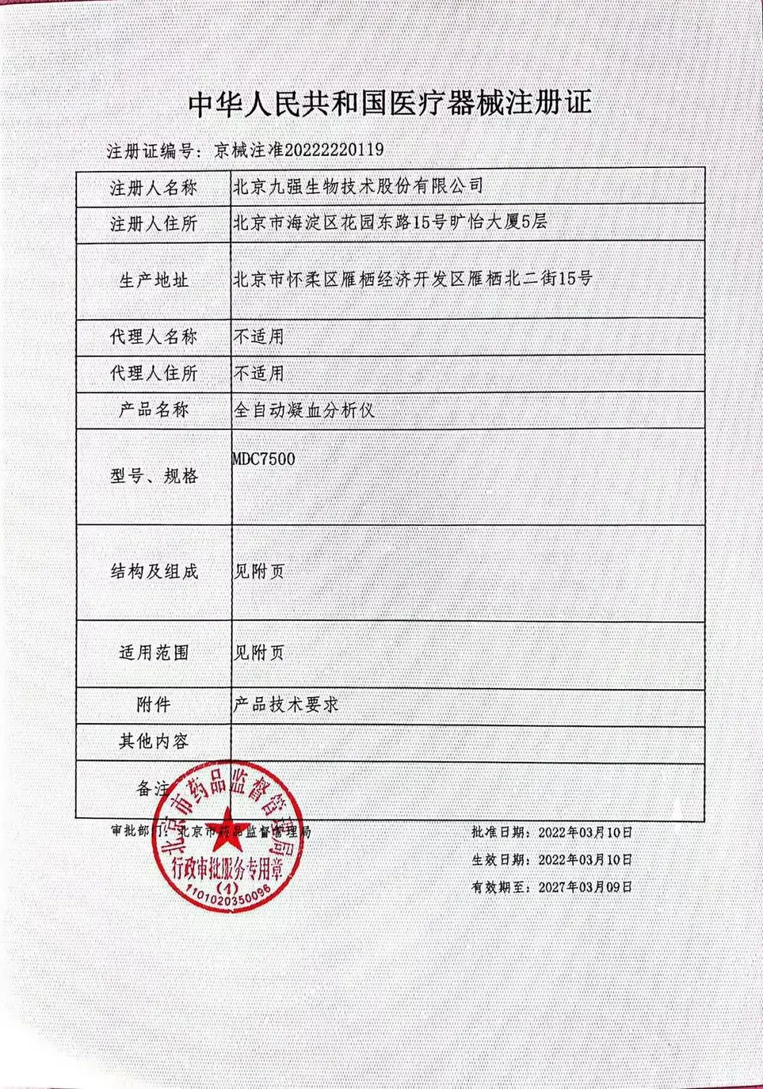 九強生物全自動凝血分析儀MDC7500順利取得北京市藥品監督管理局頒發的《醫療器械注冊證》。