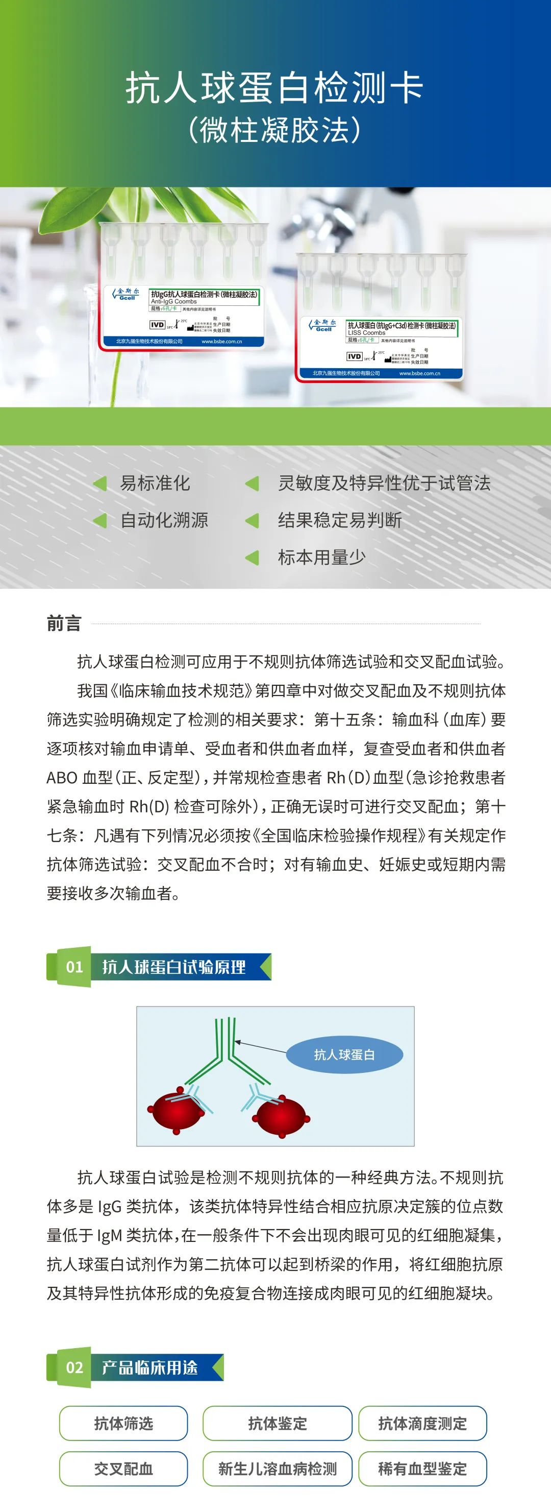 本產(chǎn)品用于間接抗人球蛋白試驗,用于交叉配血,僅用于臨床檢驗,不用于血源篩查。