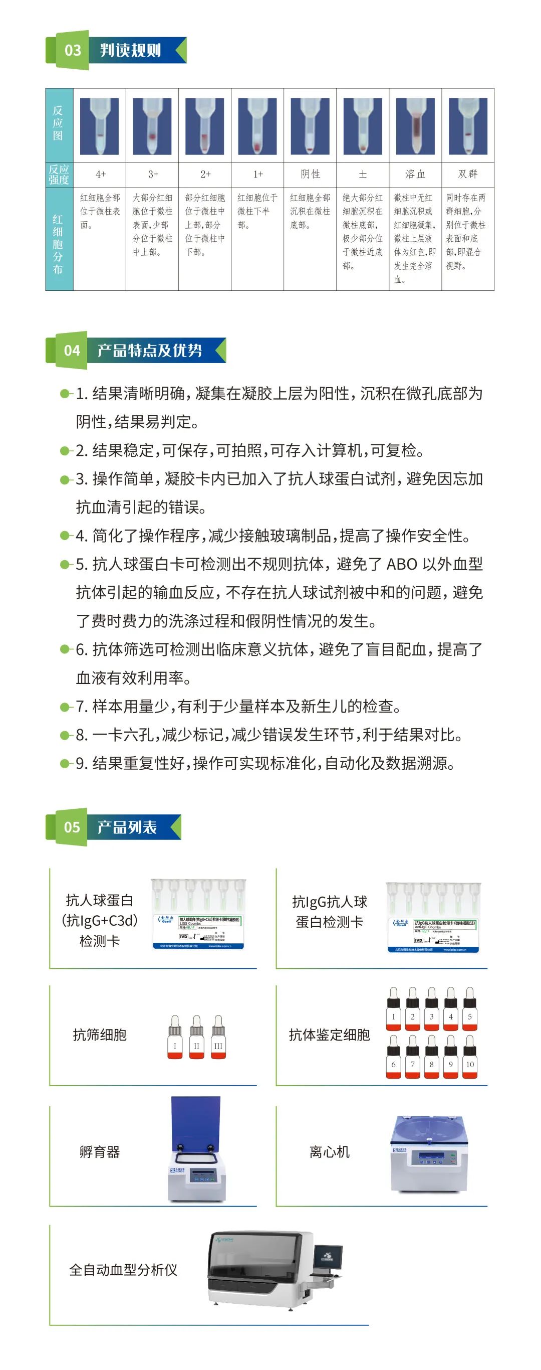本試劑盒用于間接抗人球蛋白試驗,用于不規(guī)則抗體篩查和交叉配血,僅用于臨床檢測,不用于血源篩查。