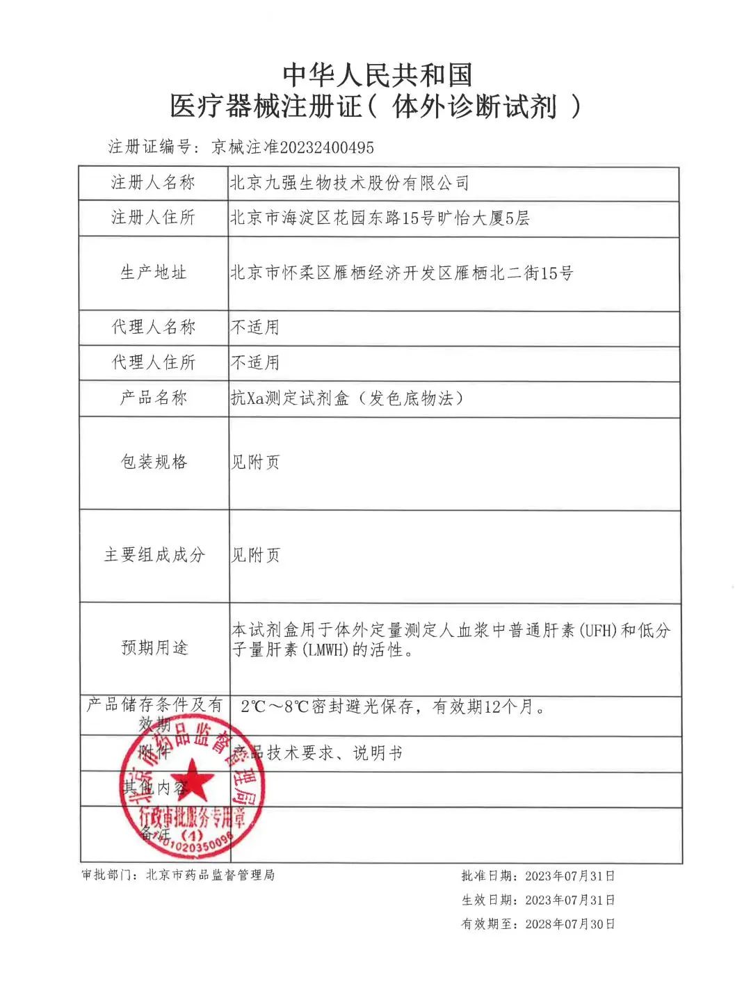 九強生物抗Xa(發(fā)色底物法)順利取得北京市藥品監(jiān)督管理局頒發(fā)的《醫(yī)療器械注冊證》。