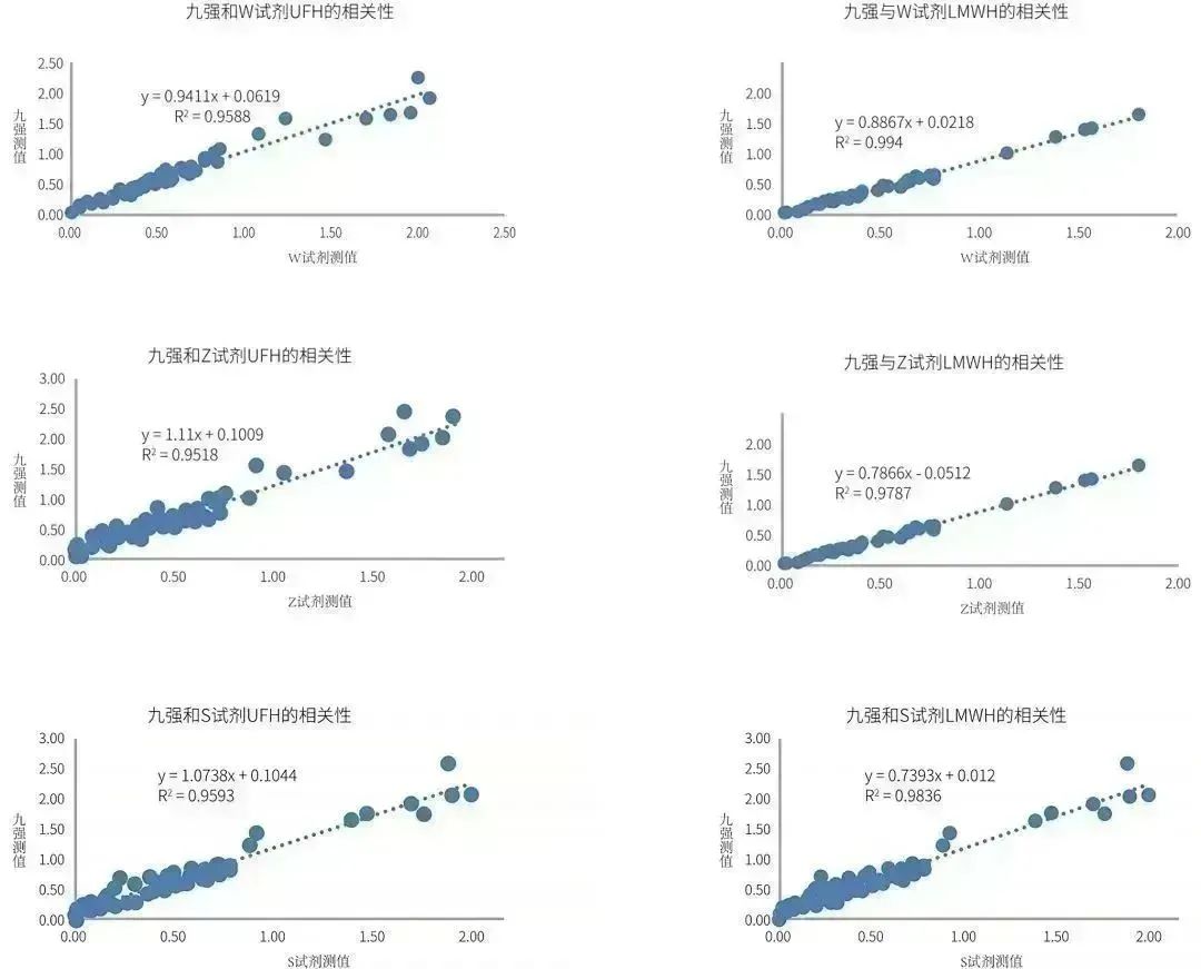 (1)國產(chǎn)抗Xa和對照試劑的測值的相關性良好:無論是普通肝素還是低分子肝素,測值相關性均在R2>0.95,可滿足臨床檢測需求;