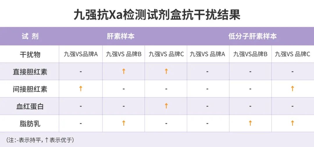 九強生物抗Xa檢測試劑盒多中心驗證數據顯示:九強抗Xa檢測試劑盒抗干擾能力優(yōu)于進口主流廠家配套試劑。九強試劑檢測普通肝素/低分子肝素樣本時,干擾物濃度低于以下濃度(直接膽紅素20mg/dl,間接膽紅素10mg/ml,血紅蛋白500mg/dl,脂肪乳400mg/dl)時無顯著干擾,回收率在90-110%。