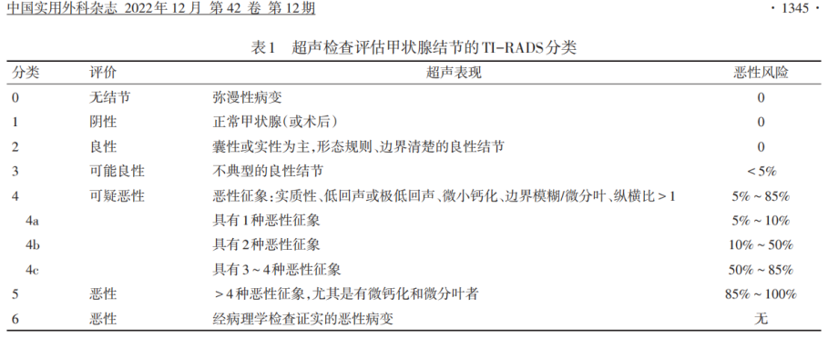 TI-RADS(Thyroid imaging reporting and data system)即甲狀腺影像報(bào)告和數(shù)據(jù)系統(tǒng)。依據(jù)五個(gè)甲狀腺結(jié)節(jié)惡性特征進(jìn)行分級(jí):①實(shí)性結(jié)節(jié);②低回聲或極低回聲;分葉或邊緣不規(guī)則;④砂礫樣鈣化;⑤縱橫比≥1。