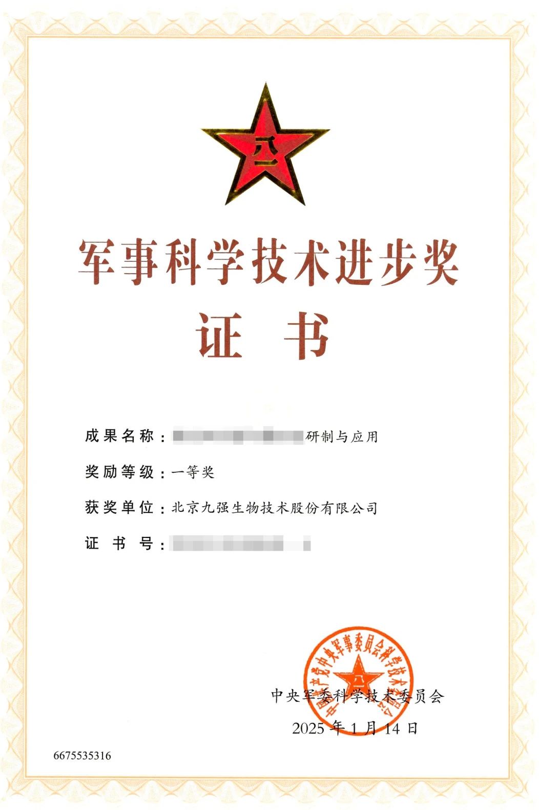 近日,九強生物憑借卓越的科研創新實力,榮獲“軍事科學技術進步一等獎”。這項殊榮是對我司在技術創新方面突出貢獻的高度認可。